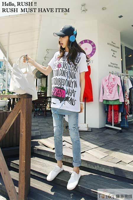 白色宽大字母T是今夏流行的热点单品,搭配窄腿铅笔磨旧牛仔裤,轻松活力的夏日装扮。