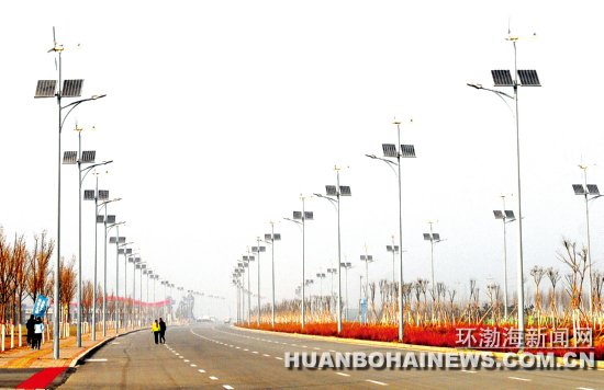 曹妃甸新城建设大力推广使用新能源。风能、太阳能、潮汐能、地热将成为城市的主要动力,四大新能源将占据未来城市能源构成的75%。一座极富魅力、国际一流的绿色生态之城正在渤海之滨崛起。图为新城通海路上的风能太阳能路灯。本报记者董军摄