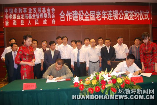 5月12日上午,唐海县政府与中国老龄事业发展基金会养老事业发展基金管理委员会就全国老年连锁公寓项目正式签约。项目选址在七农场境内双龙河以西、金熊国际项目北侧区域,总面积约800亩,项目总投资额4.5亿元—5.5亿元人民币,建设规模不低于2000个床位,达到五星级标准。