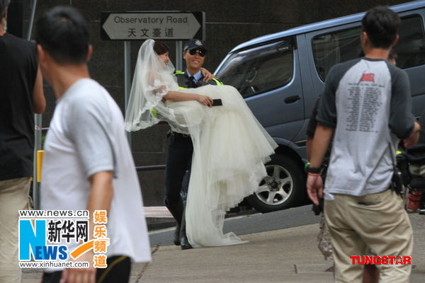 今日清晨6时,甄子丹与陈妍希在尖沙咀的街头为电影开工。陈妍希身穿婚纱并戴上头纱,与其清纯的女神形象相当吻合,身旁的助手为她撑伞遮蔽阳光,对她呵护备至。丹爷亦穿上一身交警制服,帅气十足,更在大街上一手横抱起妍希,逗得妍希开怀大笑。