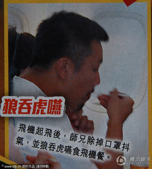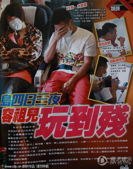 单独在经济舱的刘浩龙,刻意挑选靠近飞机门口的位子,由于飞机上大多是香港人,戴口罩的刘浩龙还用手遮住眼睛。直到飞机起飞,刘浩龙才摘下口罩透气,并拿出电话,回味手机内“头贴头”的甜蜜合照。至于坐在商务舱的容祖儿,戒备心教低,从始至终一直戴着口罩休息,未作其余遮挡。