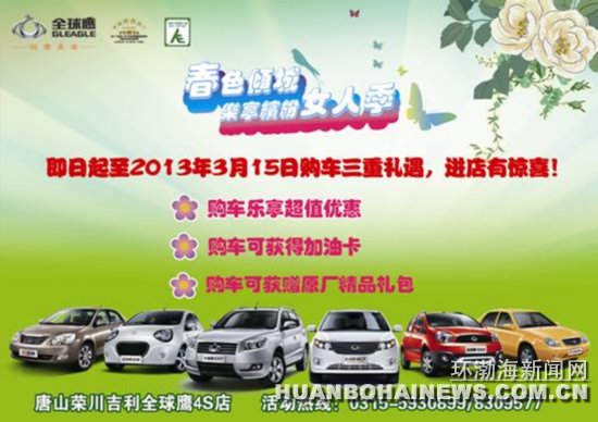 这个三月,唐山荣川吉利全球鹰全系车型:自由舰、远景、熊猫、GX2、GX7、GC7,专门针对女性消费者推出了一系列丰富的活动和优惠政策。即日起至2013年3月15日,进店客户购车乐享三重礼遇:购车超值优惠礼、加油卡、更可获赠原厂精品礼包。同时,活动期间进店女性客户皆可获得荣川吉利全球鹰提供的精美纪念品。
