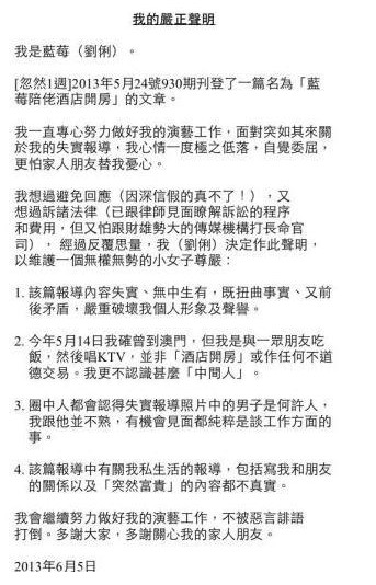 刘俐声明斥责该报道失实:“该篇报道内容失实、无中生有,即扭曲事实、又前后矛盾,单重破坏我个人形象及声誉。”