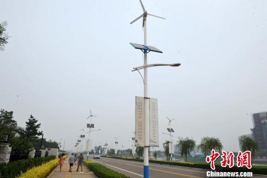 图为中国首个循环经济示范区曹妃甸街头的风能节能灯。 翟羽佳 摄