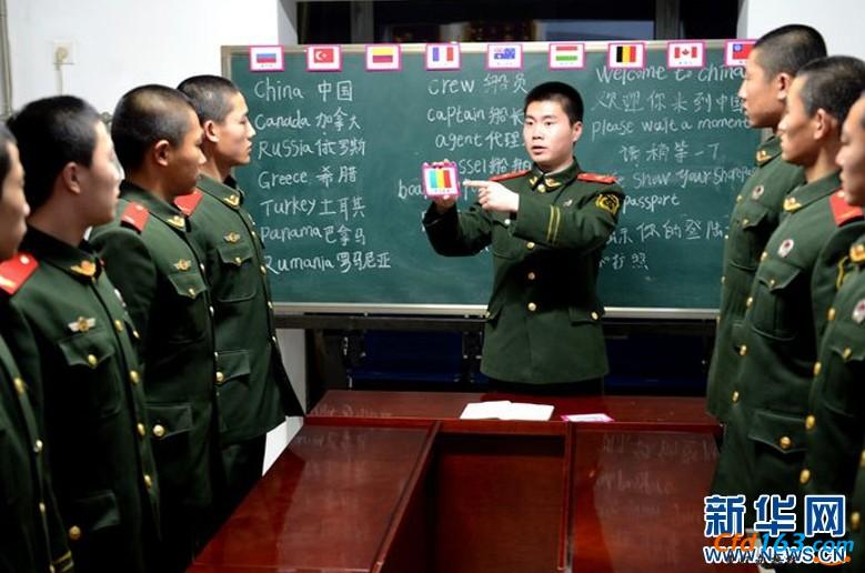 5日,河北曹妃甸边防检查站监护中队大学生士兵班长徐乐给新兵们授课,教新兵们学习识别世界各国国旗和英文名称。