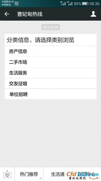 关注进入公众号后,会发现下面有三个栏目,而且三个栏目分类又有小栏,以第一个为例,热门推荐---分类信息,就会出现分类信息