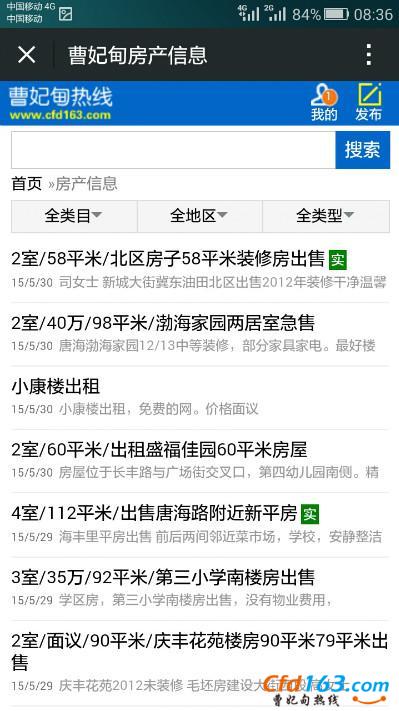 点击进入房产信息,怎么样就会发现房产信息很多呀,可以设置搜索范围,类目、地区、类型进行筛选。